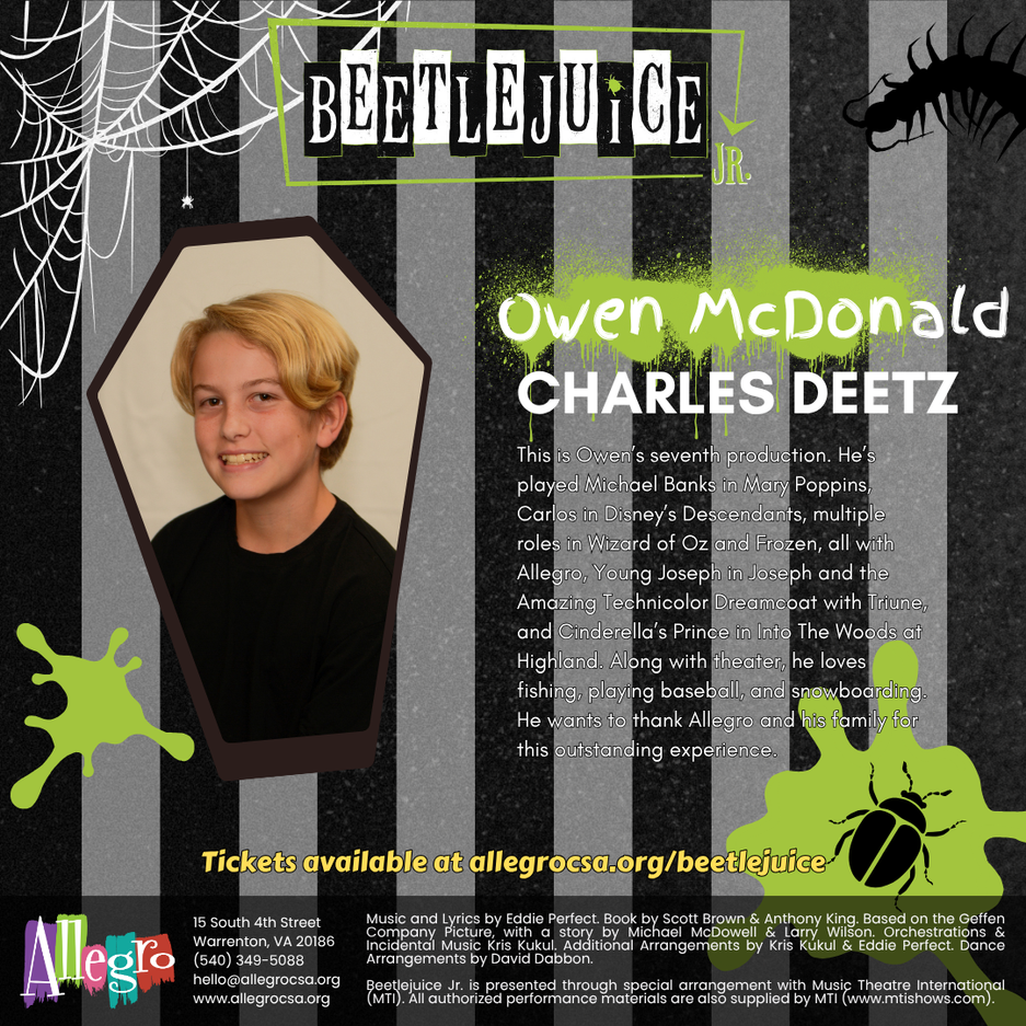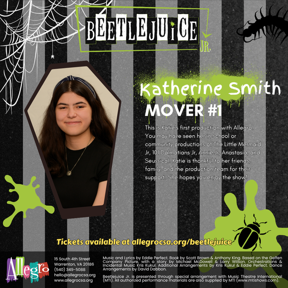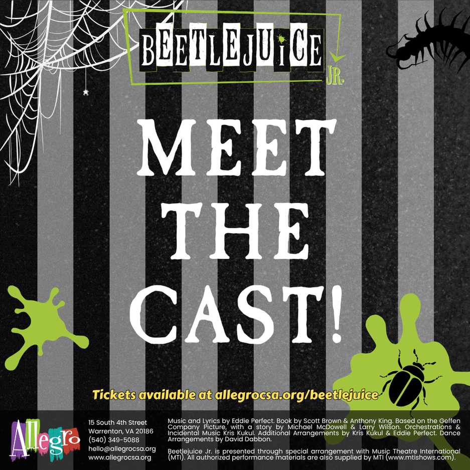 It's our show now, kid. The ghost-with-the-most comes to the stage in Beetlejuice JR., the frightfully funny musical based on the beloved motion picture turned Broadway phenomenon. Lydia Deetz is a strange and unusual teenager, still grieving the loss of her mother and obsessed with the whole “being dead thing.” Lucky for Lydia, she and her father move to a new house haunted by a recently deceased couple and Beetlejuice, a delightful demon with a real zest for life. When Lydia calls on Beetlejuice to scare away anyone with a pulse, this double-crossing specter shows his true stripes, unleashing a (Nether)world of pandemonium.